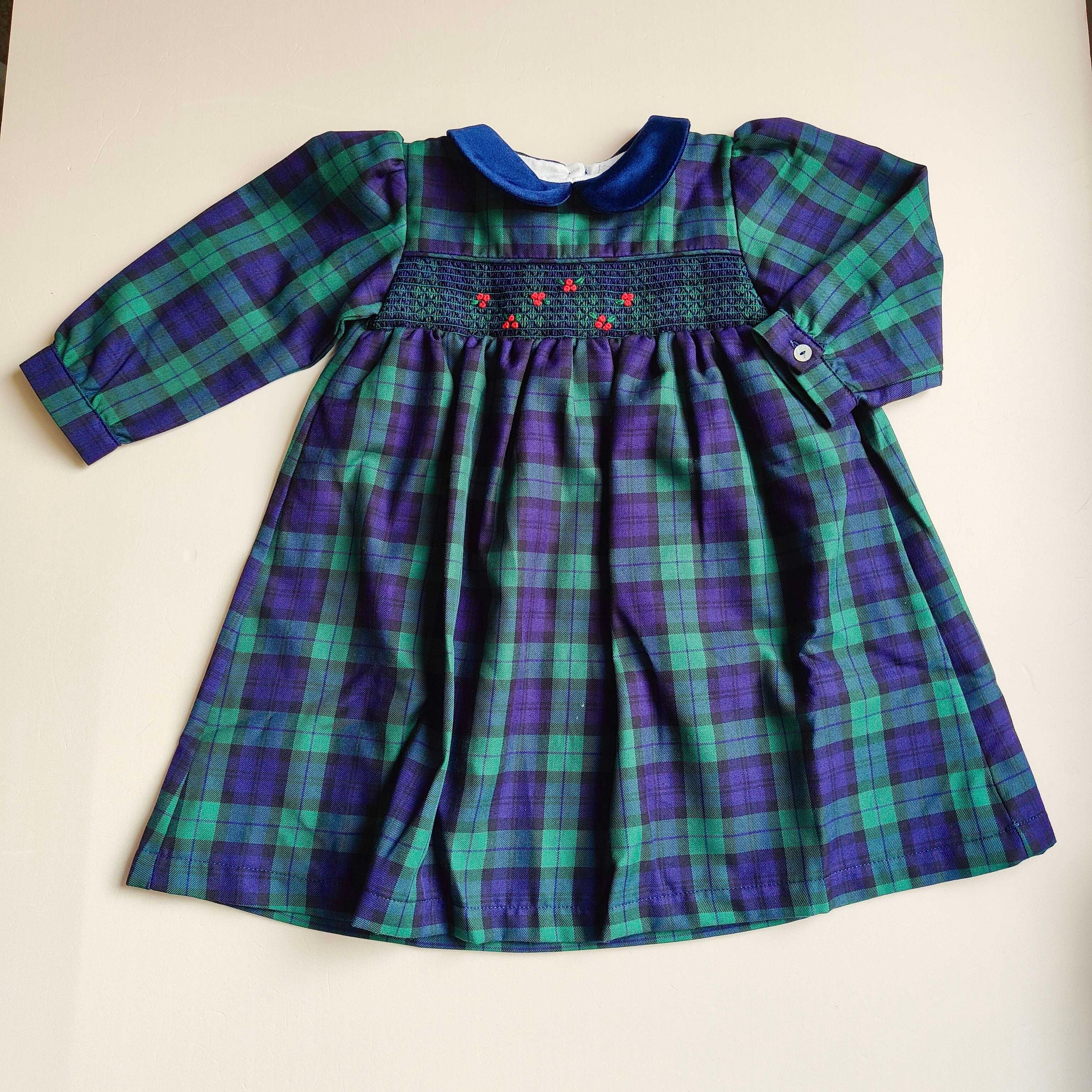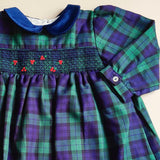 Abitino scozzese con punto smock e agrifogli ricamati a mano , colletto in velluto
