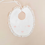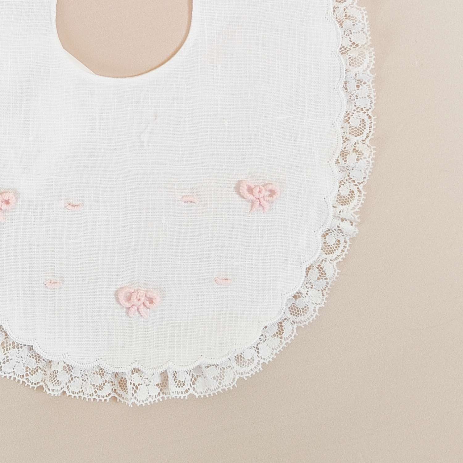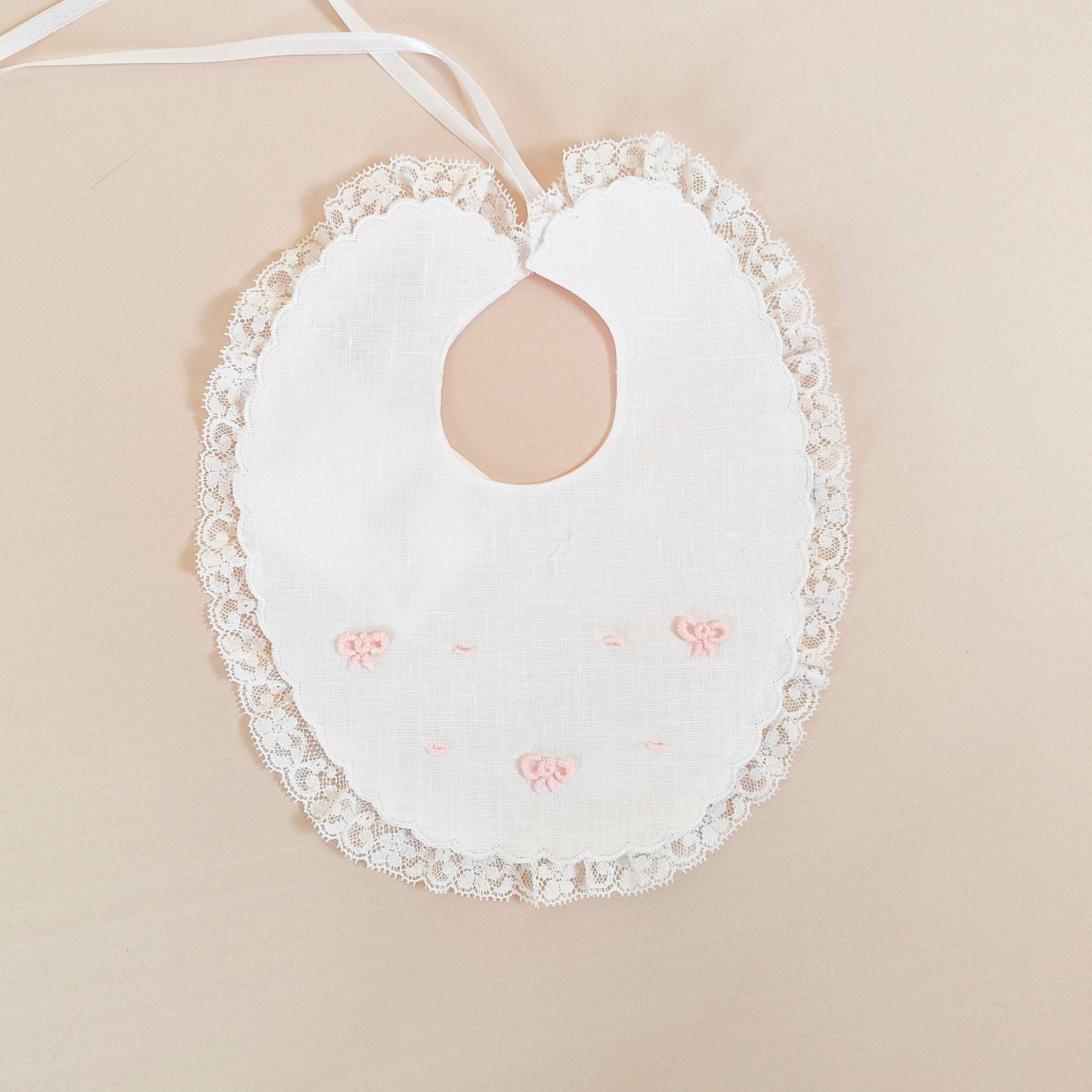 Bavetta in puro lino con fiocchi ricamati a mano e pizzo valenciennes