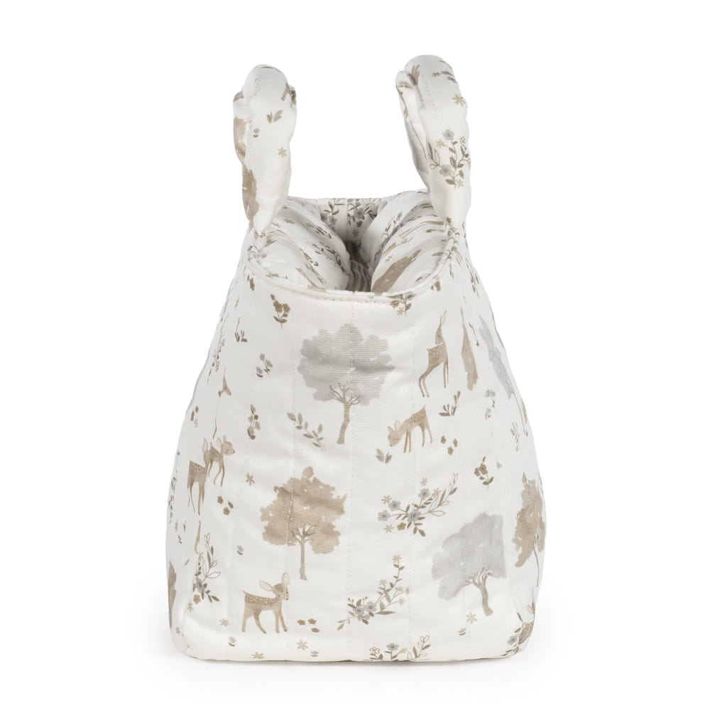 Il beauty case per bebé Nara di Pasito a Pasito, realizzato in 100% cotone con una delicata stampa di cervi e alberi in tonalità neutre, è una piccola borsa pensata appositamente per trasportare tutti i prodotti per la cura del bambino quando si è fuori casa