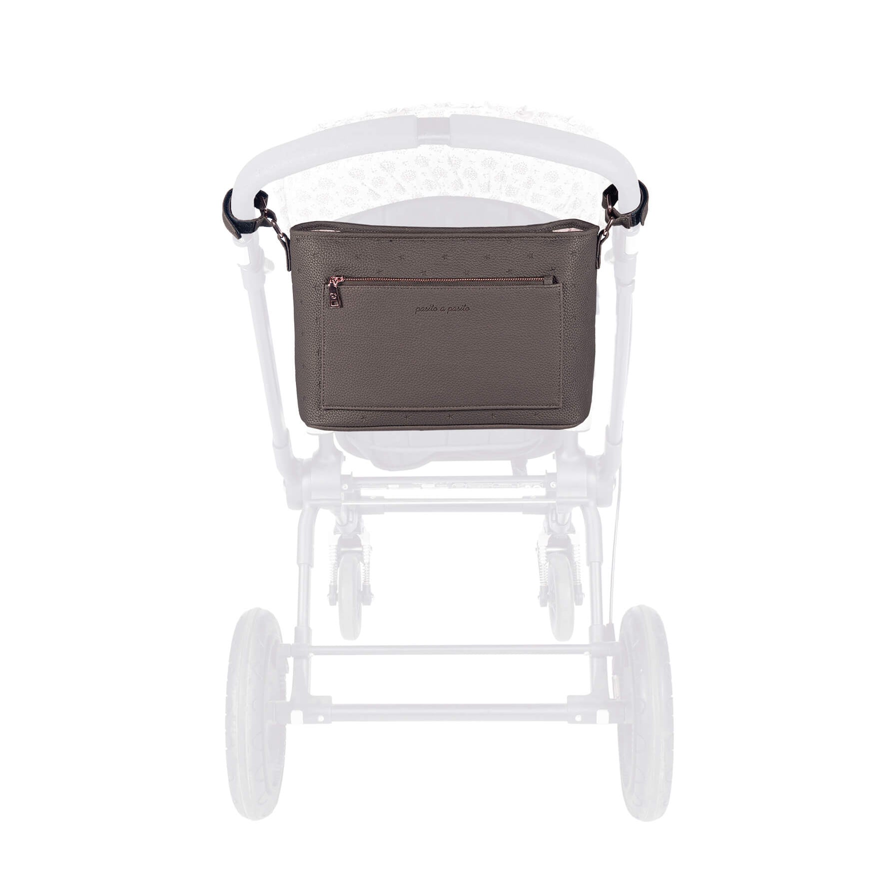 Borsa organizer per passeggino London in similpelle marrone con stelle. Borsa di grande capacità per trasportare tutto il necessario per il tuo bambino. Dispone di utili tasche esterne e interne in modo da avere tutto in ordine. La borsa include 2 manici corti regolabili per appenderla in qualsiasi modello di passeggino. Si può lavare a mano o in lavatrice a 30º. I materiali utilizzati sono esenti di coloranti azoici, ftalati e sostanze nocive alla salute
