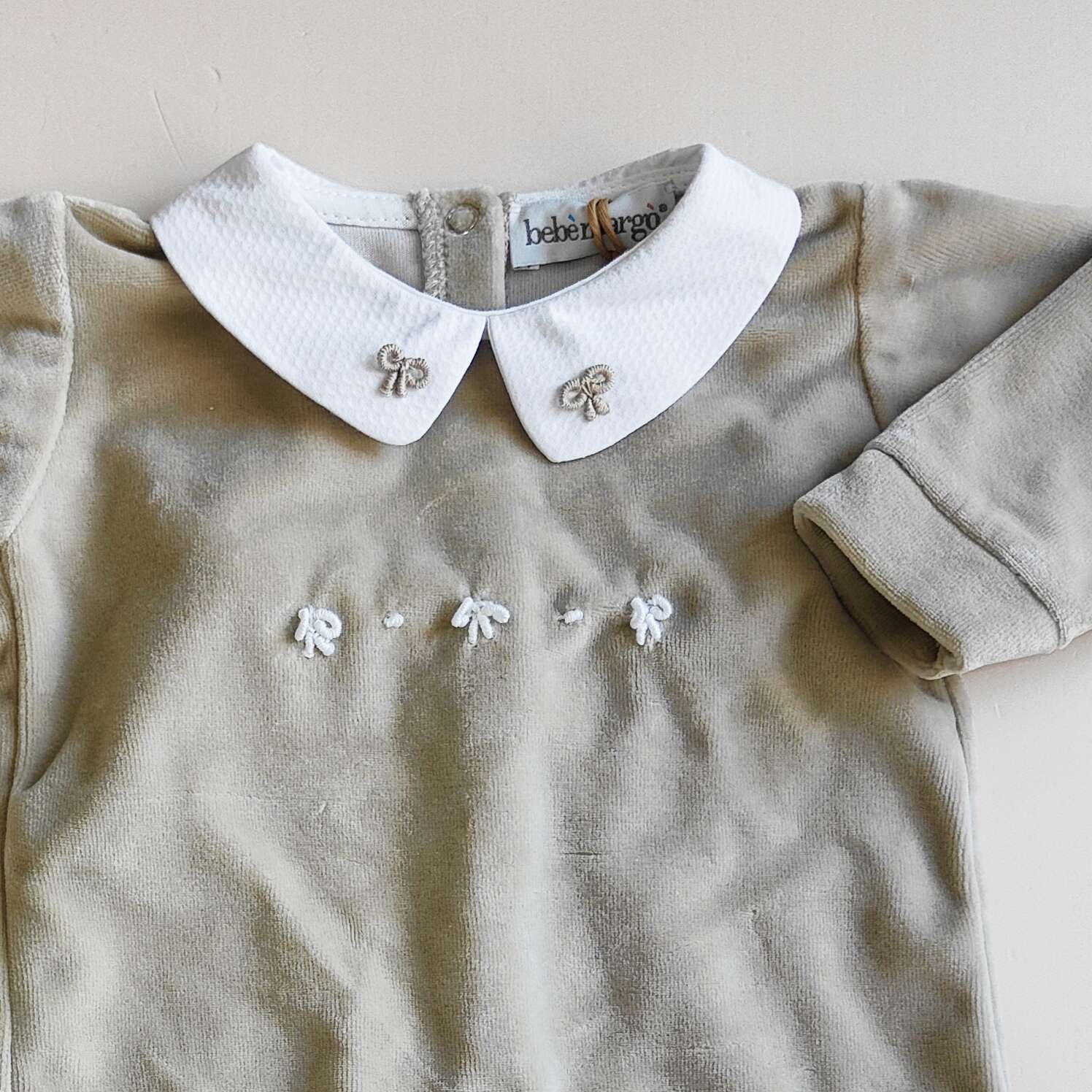 Completino in ciniglia con fiocchetti ricamati a mano , colletto in piquet