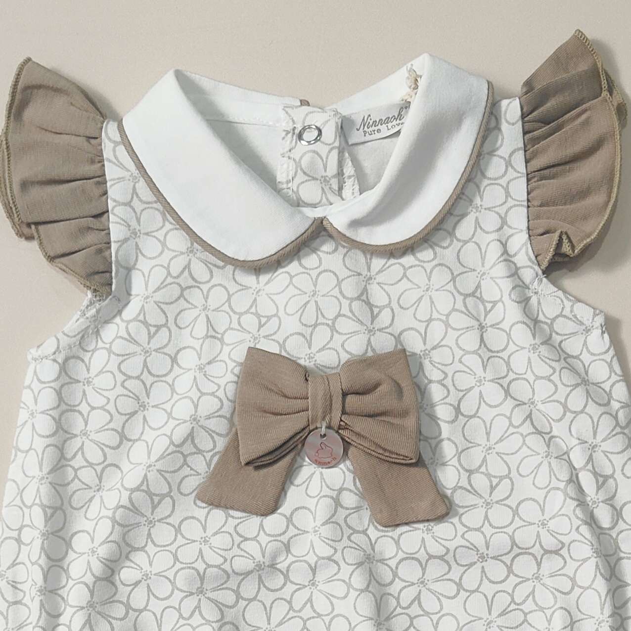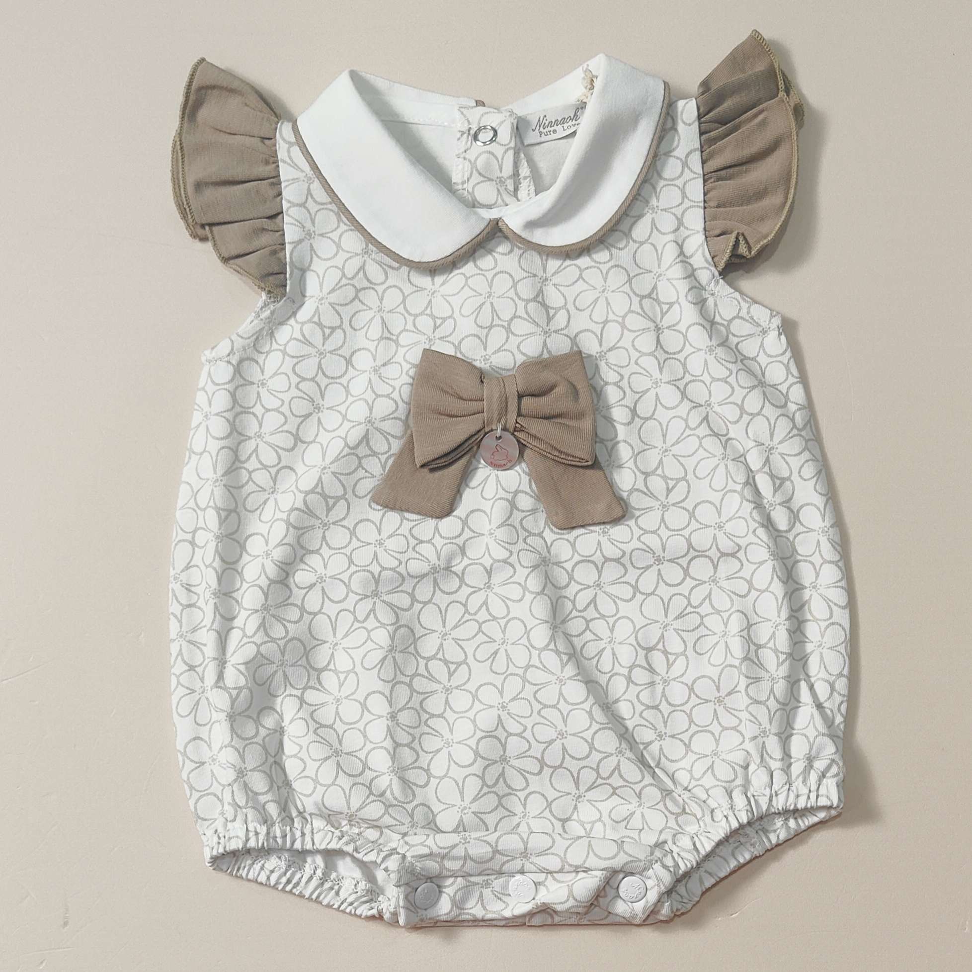 Pagliaccetto stampa margherite con fiocco e maniche rouche