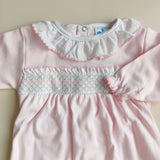 Tutina in cotone caldo con punto smock sul petto e colletto rouche