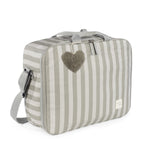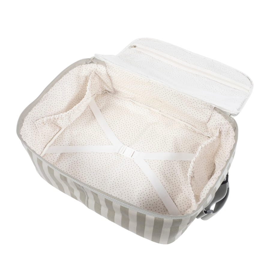 La valigia per neonati Sintra a righe beige è una borsa pensata appositamente per il momento più importante della gravidanza, ovvero l’arrivo del bambino. Valigia pensata per trasportare tutto il necessario per voi, per il papà e per il bambino. Questa valigia per neonati è il modello perfetto per contenere tutto ciò che non può mancare in questo giorno speciale. È comoda, leggera e maneggevole, con dimensioni rettangolari e una pratica apertura per coprire tutte le esigenze. Ha una sicura chiusura a zip a due vie per una facile apertura, una lunga tracolla e manici corti per il trasporto. Lo scomparto interno è foderato in tinta con gli elastici per contenere i vestiti e tenere tutto a posto. Include un ciondolo a forma di stella su cui è possibile ricamare il nome del bambino per personalizzare la borsa.